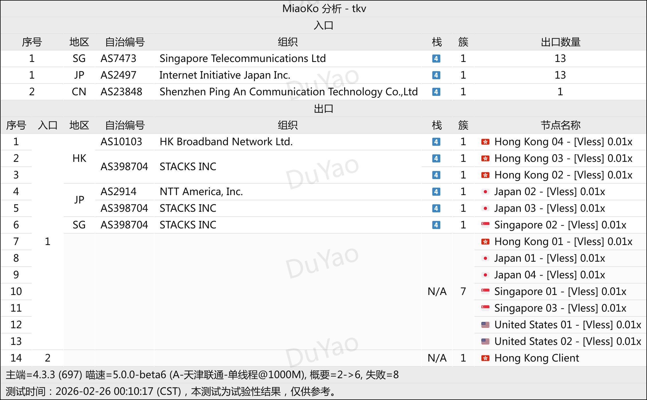- 落地:香港 MisakaF、Stacks;日本 Akari、IIJ;新加坡 Sintel、SpeedyPage、Akari、Eons;澳门 CTM;台湾 Akari;德国 Hetzner、Misaka;美国 Stacks、Misaka等